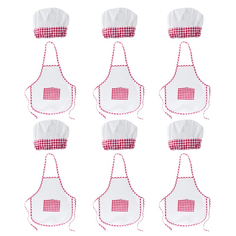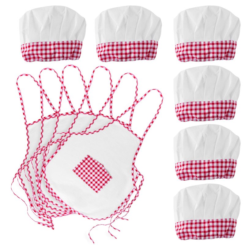 - Full unisex cooking dress up set is recommended for children. One size fits most. Apron strap measures 14" and is easily adjustable. Comes in a total of 12 pieces. 6 aprons and 6 chef hats.
