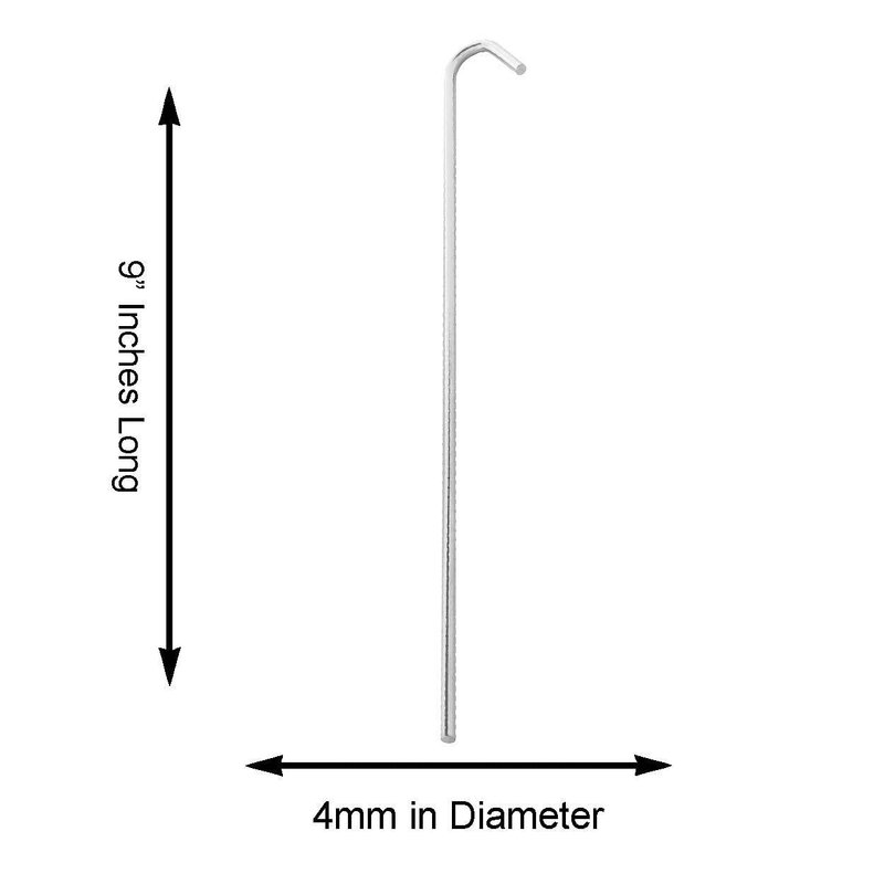 - Each steel stake measures at 9" inches long for extra security when anchoring your items. 4mm diameter heavy duty steel rod with galvanized finish for superior rust-resistance in outdoor weather.