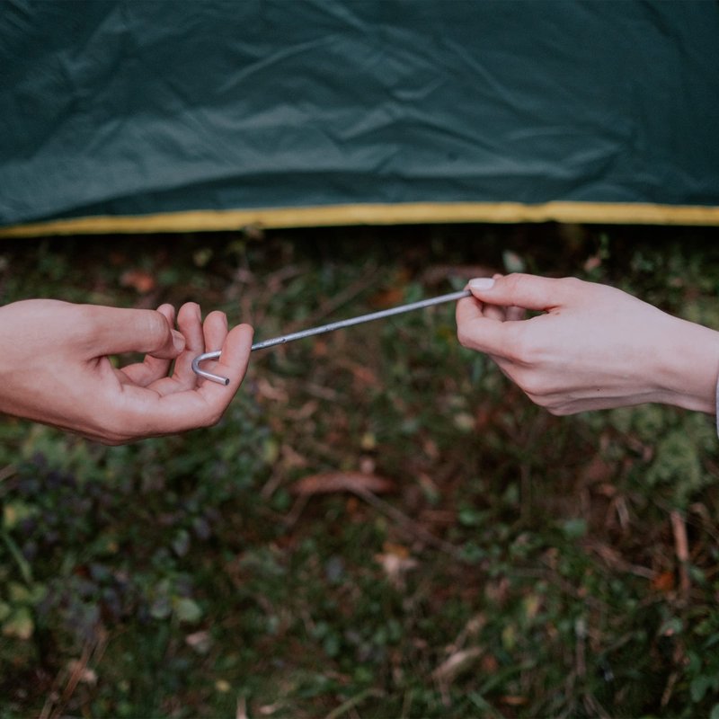 - These silver steel tent pegs are good for holding down any tent for an easy camping trip. Helps anchor your largest tents. Steel construction makes these tent stakes easy to penetrate the roughest terrain. Drive it right into the ground or sand and keep your tent from blowing away when you are camping.