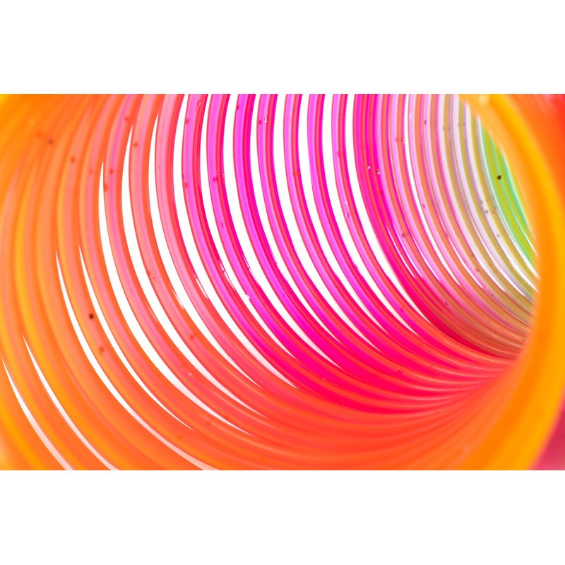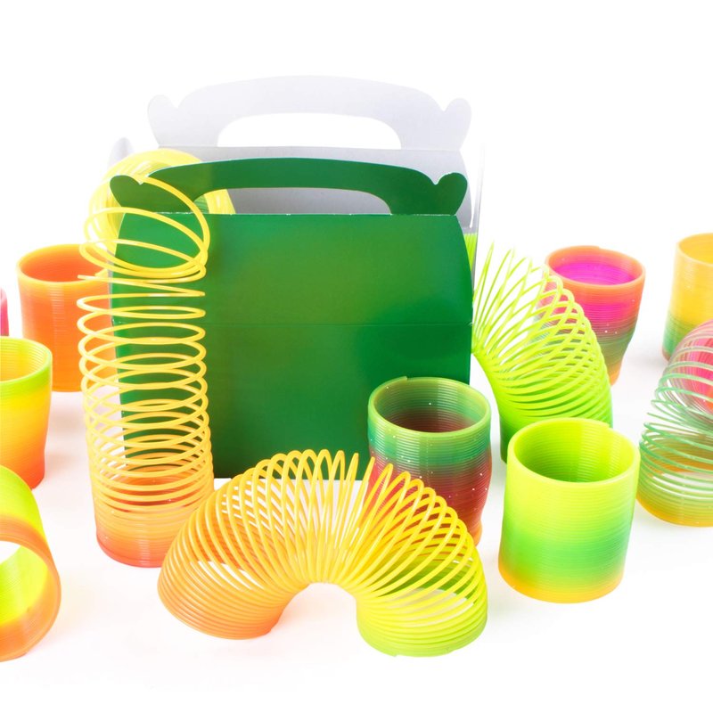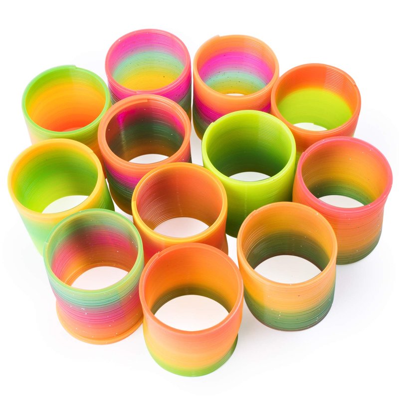 - Vivid looking multi-color blend through each coiled plastic toy. Colors include orange, green, yellow, purple, pink, and blue. Every order includes a package of 12 toy springs in total. With 6 Glitter and 6 Non-Glitter Neon rainbow spring toys.