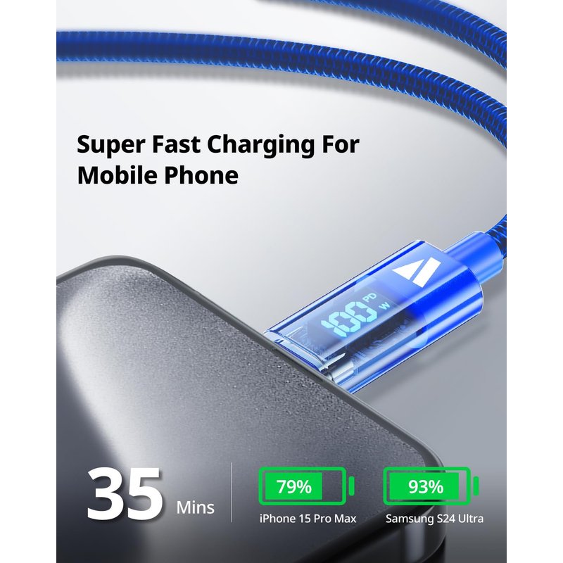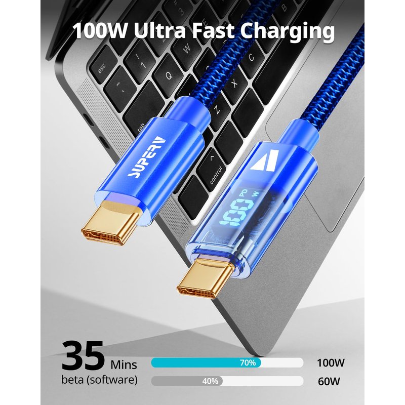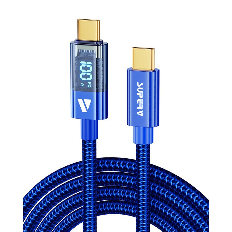 SUPERV 6.6ft/200cm Type C Cable Type C Charger Fast Charging Cable 5A PD 100w 6.6FT USB C Cable with LED Display 480Mbps Data Nylon Braided Blue Cable