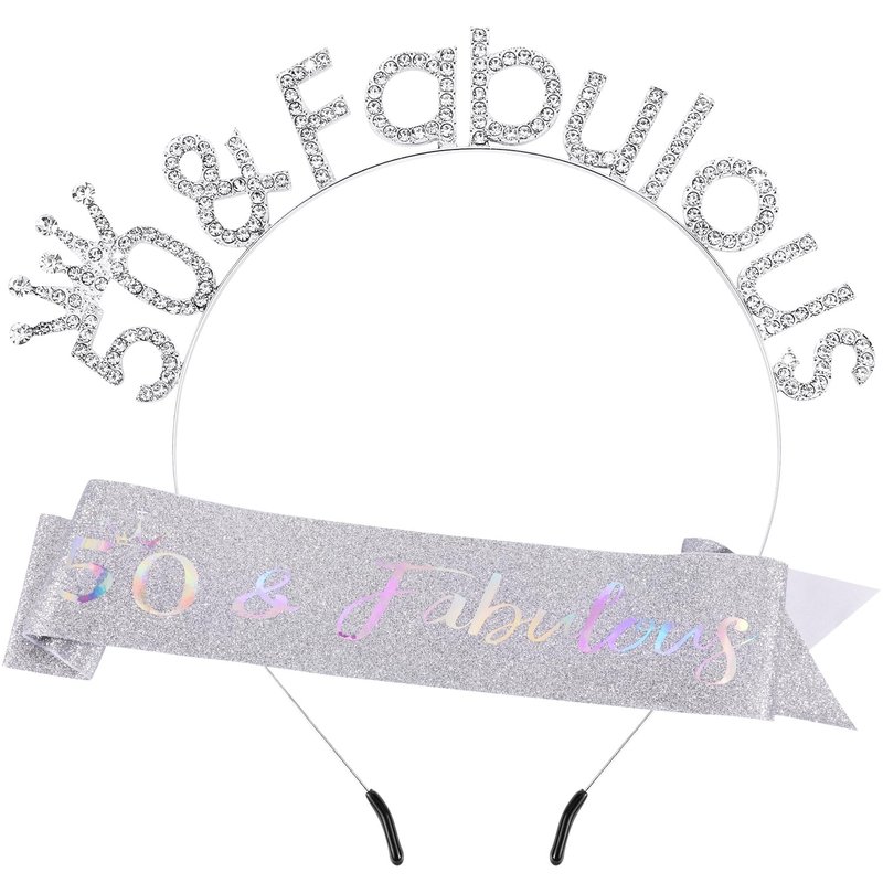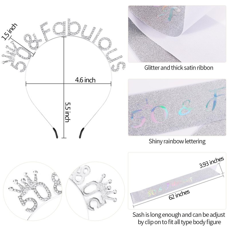 SuPoo Silver 50th Birthday Sash and Tiara Kit 50 & Fabulous Birthday Headband Crown 50th Birthday Decorations for Women 50th Birthday Gifts for Her 50 Year Old Happy Birthday Party Decorations