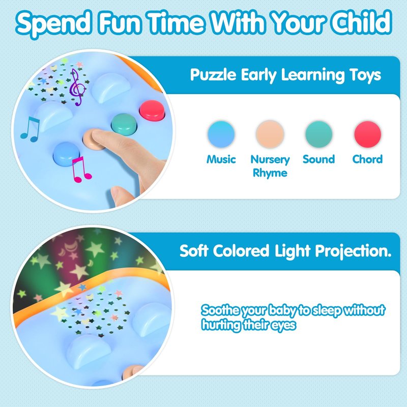 - Gentle Colorful Lights and Musi: It plays nursery rhymes, and have four modes to choose promoting auditory and cognitive development. This baby rattle teether features gentle and colorful light projection, can help soothe babies to sleep without harming their eyes. Babies fall asleep under the cozy lights, and parents appreciate the convenience and peace of mind this toy brings. As a perfect baby shower, birthday, or holiday gift, it is an ideal and practical choice for any baby family.