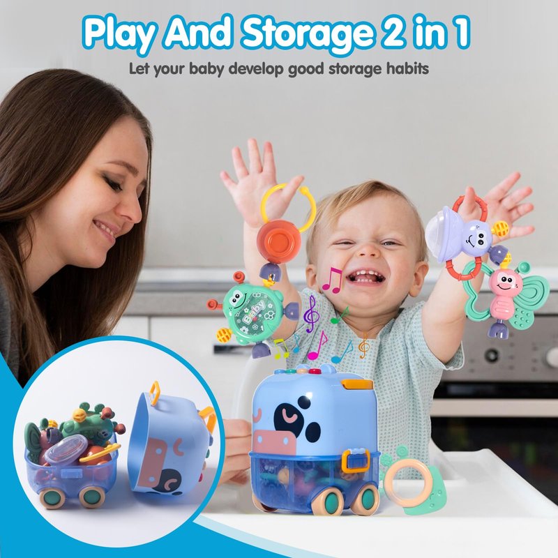 - Multi-functional Push Car Design: This push car with wheels and a handle is both a toy and a storage box. Babies can push the car around the living room, enjoying the mobility and fun. The design allows the toys to be strung together and hung on strollers, cribs, or car seats, adding more playtime fun. Watch your baby push the car, listen to nursery rhymes and melodies, and manipulate the toys with dexterous fingers, giving parents a moment of relaxation and satisfaction.