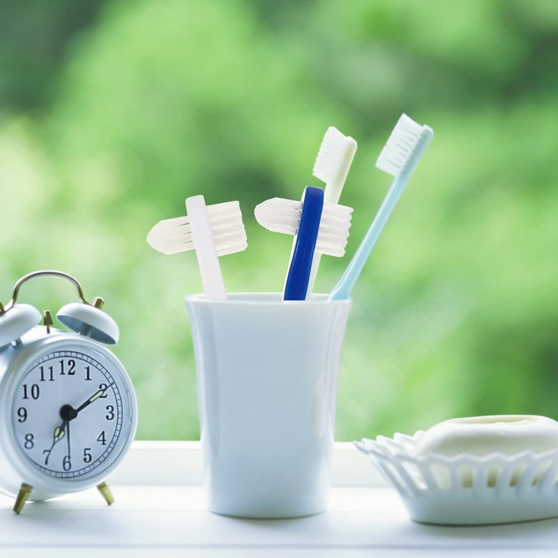 It may take you more time to clean false teeth than normal teeth because dentures require daily brushing for freshness and effective stain removal, and effervescent cleansers alone cannot remove all food particles and stains. So denture brush is recommended to help you get a more thorough clean. This kind of double-sided brush with different shapes of bristles will be the best choice for you.