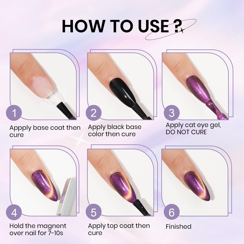 - Tips For You: Please skin test before using to avoid allergic; Base gel and top coat are necessary; Ensure each layer is properly cured; Please hold the magnet over nails for 7-10S to get stunning cat eye effect