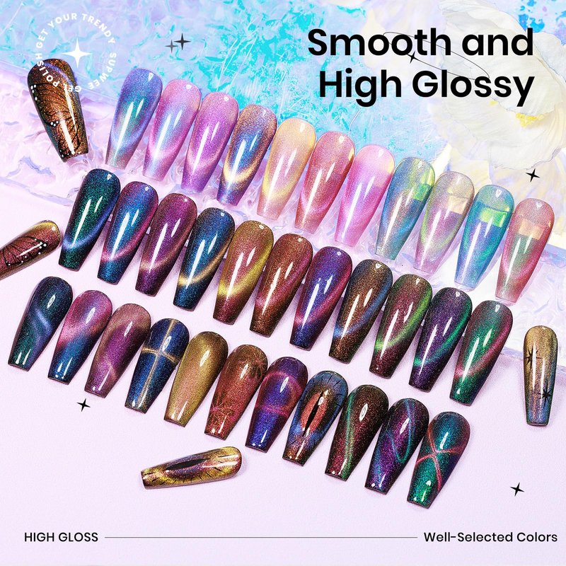 - Variety of Cat Eye Effects: Each cat eye gel polish in this set offers a unique cat eye effect when exposed to a magnet, allowing you to create different cat eye effects, like the galactic hole effect, slash effect, starry sky effect, etc