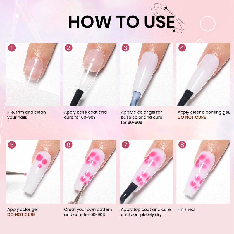 - 👀To ensure you have the best results, we advise following these instructions:√1.Base and top coat are necessary √2.Blooming gel is clear texture, only when used together with color gel will it get the colorful blooming effect √3.Use a nail art pen to paint better the effect you want