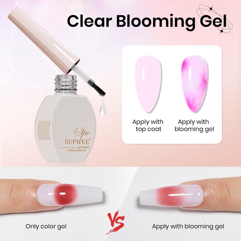 - 💅Try Different Color combinations: Our blooming gel is a clear texture that,, only when used together with color gel will get the colorful blooming effects, To create the blooming effect, simply apply the clear blooming gel over a colored nail polish
