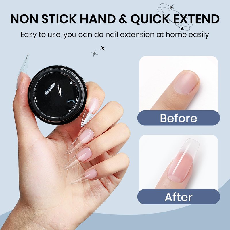 - Non Stick Hand Solid Builder Gel: You will get 1*14g Clear Nail Extension Gel and 36PCS Nail Extend Mold. This all-inclusive kit enables you to create salon-quality nail extensions in the comfort of your home, saving both time and money
