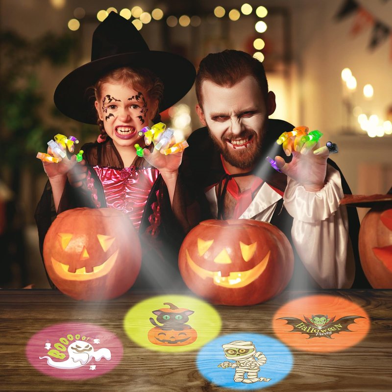 - [ Halloween Party Favors ] You will get 6 designs of Halloween LED finger projector lights, 6 pcs of each design, 36 pcs in total. Each light projects a Halloween theme pattern out when you press the button, turn out super cool, fun Halloween toys for kids