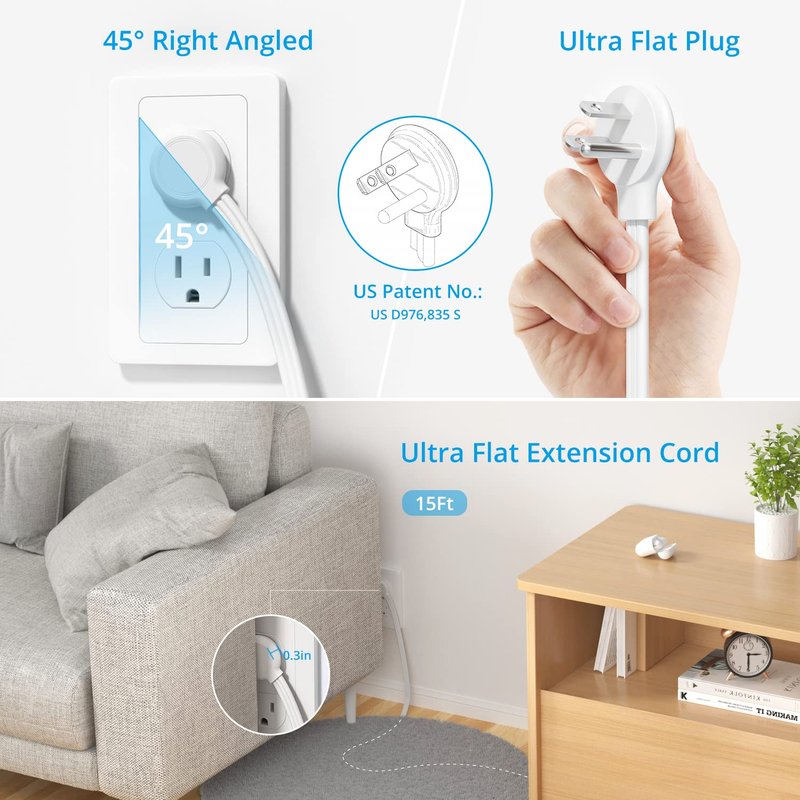 - Thin Flat Plug Power Strip - With only 0.3 inches thick flat plug design, the low-profile plug shape of this flat power strip can fit easily behind sofa, bed, furniture and get close to the wall. The 45-degree right-angled thin flat plug ensures it won't block the bottom receptacle of your duplex wall outlet, free it up for other uses. Also, this power strip flat plug has been patented in the US (Patent No.: US D976,835 S).