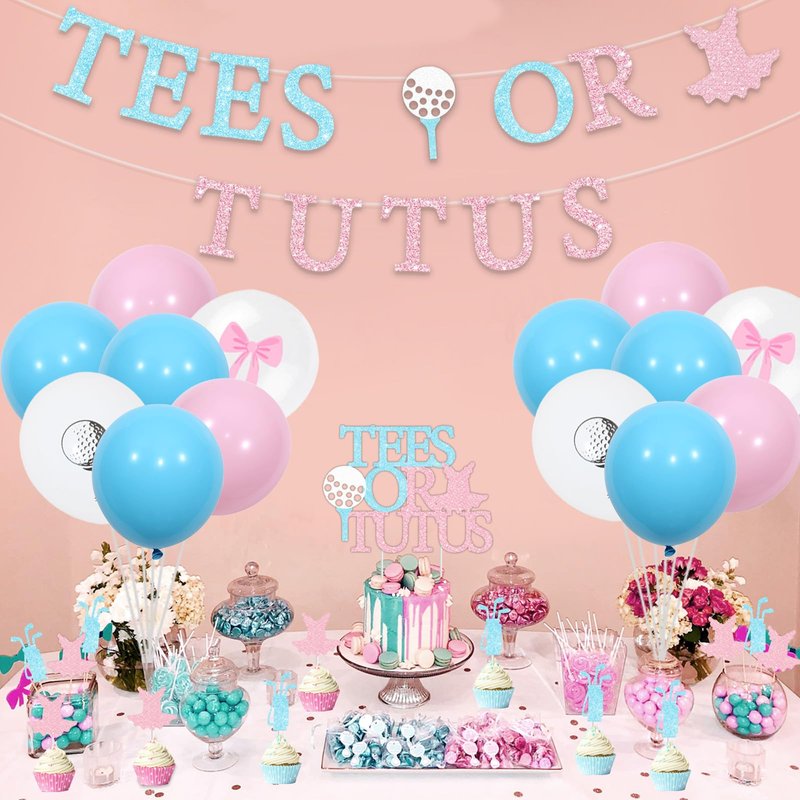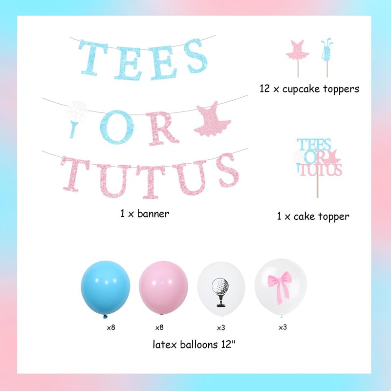 - Golf Gender Reveal Decorations: Include 1pc tees or tutus banner, 1pc tees or tutus cake topper, 12pcs golf and tutu cupcake toppers, 22pcs latex balloons 12”.