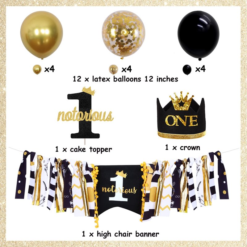 - Package List: The notorious one birthday decorations come with 1 notorious one high chair banner, 1 glitter notorious one cake topper, 1 one birthday hat and 12 latex balloons 12”. Ideal for boys black and gold 1st birthday.