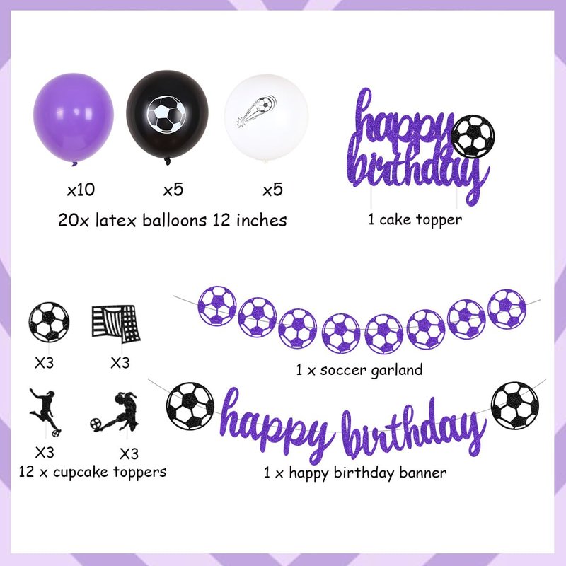 - Soccer Birthday Party Decorations: Include 1pc soccer happy birthday banner, 1pc soccer garland, 1pc soccer happy birthday cake topper, 12pcs soccer cupcake toppers, 20pcs latex balloons 12”.