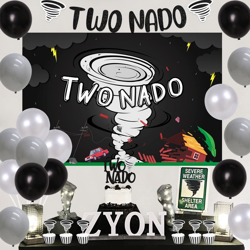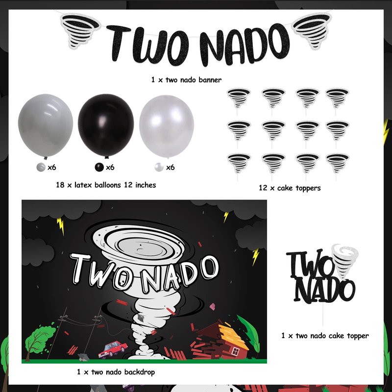 - Tornado Birthday Decorations: Include TWO NADO banner, TWO NADO backdrop 5 x 3 ft, TWO NADO cake topper, 12pcs tornado cupcake toppers and 18pcs latex balloons 12β.