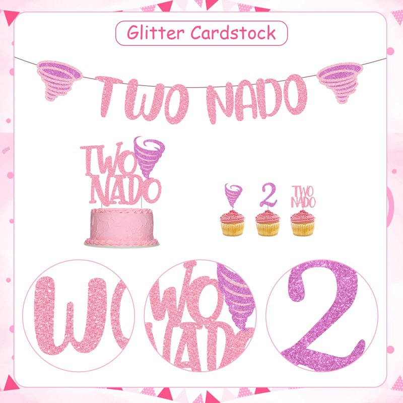 - Cake Topper: This "TWO NADO" cake topper has the pink “TWO NADO” words and purple tornado pattern. It is very shiny, which can be inserted into the cake. It will stand out even more at the party to celebrate this important and memorable moment!