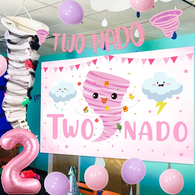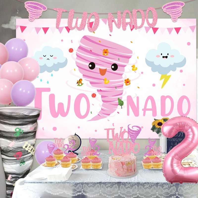 - Exquisite Design: This tornado birthday party decoration main color is pink, purple and white, which is loved by girls. The backdrop is printed with a lovely tornado pattern and two cloud patterns. Combined with cake topper, banner, they will become a big hit for your two nado 2nd birthday.
