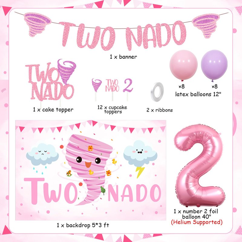 Package Includes: 16 x latex balloons 12 inches(8 purple and 8 pink) 1 x pink number 2 foil balloon 40 inches(helium supported) 1 x “TWO NADO” backdrop 5*3ft 1 x “TWO NADO” cake topper 12 x cupcake toppers 1 x “TWO NADO” banner 2 x white ribbons 33ft