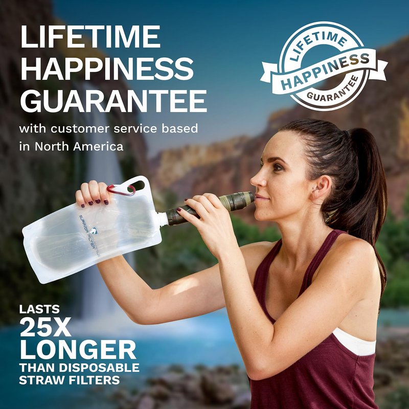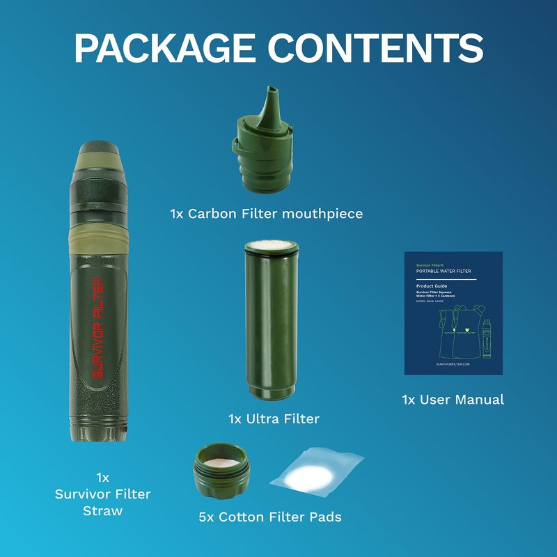 The Ultimate Portable Water Filter Straw The Survivor Filter Personal Water Filter is the ultimate tool for your bug-out-bag, emergency kit or overseas travel. Cleaning water down to a filtration level of 0.05 Microns, that's at a cellular level. Thanks to the Triple Filtration System, the Survivor Filter is 400% better than Lifestraw at 0.2 Microns. Use the Survivor Filter Straw with any fresh water source when you're casually out on the trail, deep into a hike or drinking the water while travelling overseas. Simply drink straight from the source, attach it to our Collapsible Canteensor to any 28mm threaded bottle. It works with three filtration stages that has been tested at Multiple USA labs to show: Log 5 Removal 99.999% of Protozoa (Cryptosporidium, Giardia and Parasites) Log 5 Removal 99.999% of tested Virus (Phi X-174), Staph and Bacteria 89% Mercury and Lead Removal Overview Stage 1:Cotton Filter Pad This is the direct contact with your water source to block out large particles and sits in the water inlet of the Survivor Filter Straw. It can be reused up to 1,000 liters and your straw comes equipped with 5 additional cotton pads. Stage 2:Ultra Filter Then the water moves through the Ultra Filter - located inside the Straw to block pollen, algae, Giardia, E.Coli, Protozoa, Cryptosporidium, bacteria and toxins. Independent tests have shown that the 0.05 Micron Ultra Filter can filter out 99.999% of tested virus and staph. The Ultra Filter can be easily back washed and reused up to 100,000 liters. Stage 3:Carbon Filter Mouthpiece Finally, remaining contaminants gets trapped to the Carbon Filter Mouthpiece, which will reduce heavy metals, chemicals and improve the water taste and odor. The Carbon Filter Mouthpiece can be reused up to 1,000 liters. Specifications: Product SKU#:L600 Replacement Filter SKU#: Cotton Filter Pad: L600-CPK Ultra Filter: L600-UF Carbon Filter Mouthpiece: L600-CF Capacity: Cotton Filter Pad: up to 1,000 liters (264 gallons) Ultra Filter: up to 100,000 liters (26, 417 gallons) Carbon Filter Mouthpiece: up to 1,000 liters (264 gallons) Flow Rate:200ml per minute (6.8 ounces/minute) Size:7 x 1.4 x 1.4" Weight:3.5 oz Components: Survivor Filter Straw 6x Cotton Filter Pads 1x Ultra Filter 1x Carbon Filter Mouthpiece 1x User Manual Useful How-to Videos Backwashing Your Survivor Filter