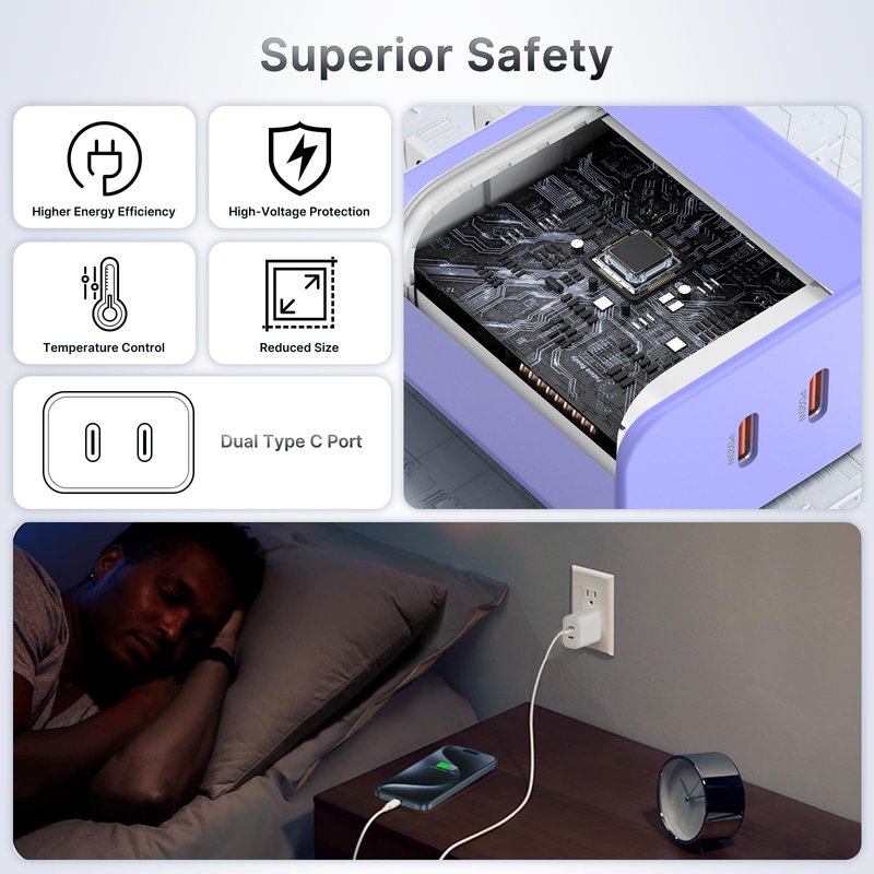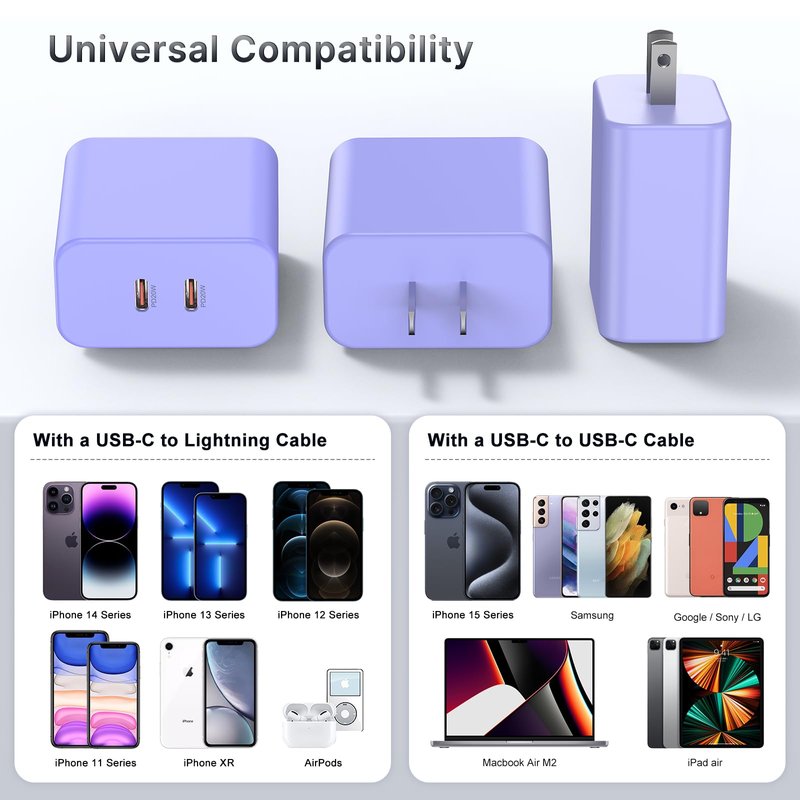 - 40W USB C Chargers: iphone charger is equipped with 2 USB-C ports to allow you to charge 2 devices at the same time.