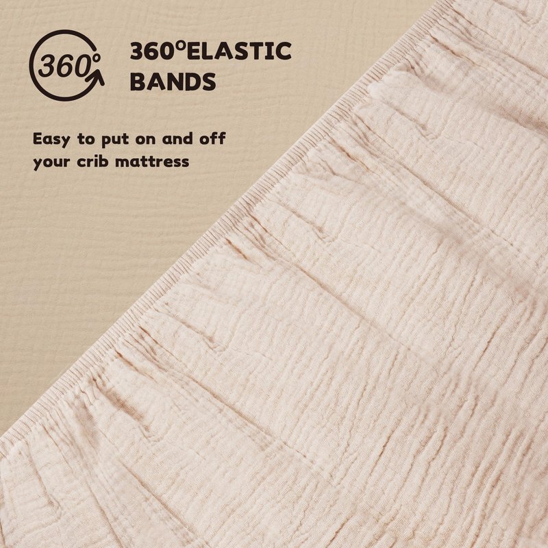 - Perfect Standard Size: With a 28" x 52" (71 X 133 cm) size, our crib sheets are designed to fit most standard crib and toddler bed mattresses. Featuring a 360° elastic band and 9" deep pockets, these muslin crib sheets securely hug your mattress, providing a snug and secure fit.