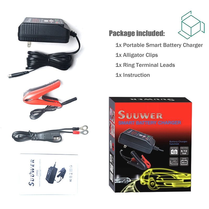 Suuwer’s battery charger can charge all types of 6V/12V 4ah 5ah 6ah 7ah 7.2ah 8ah 9ah 12ah 12.7ah 13ah 14ah 18ah 19ah 20ah 24ah 28ah 30ah 33ah 35ah 40ah 45ah 48ah 50ah 55ah 65ah sealed lead acid battery, including flooded or sealed maintenance free batteries (SLA, ATV, AGM, gel cell).
