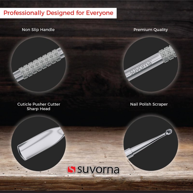 - 5.25 inch Pusher Professionally designed for everyone: Texturized slender improves the grip while using a Cuticle Pusher or fingernail cleaner tool for manicure or pedicure. Suvorna Nail Pusher Tool and Cuticle Eliminator are manufactured so well that anyone can maintain their cuticle health. Nail Polish Remover Tool are made for every demographs that a girl, boy, women, men, or elderly people can use for their nailcare for nail cuticle. So literally our Nail Pusher Cuticle are for everyone.