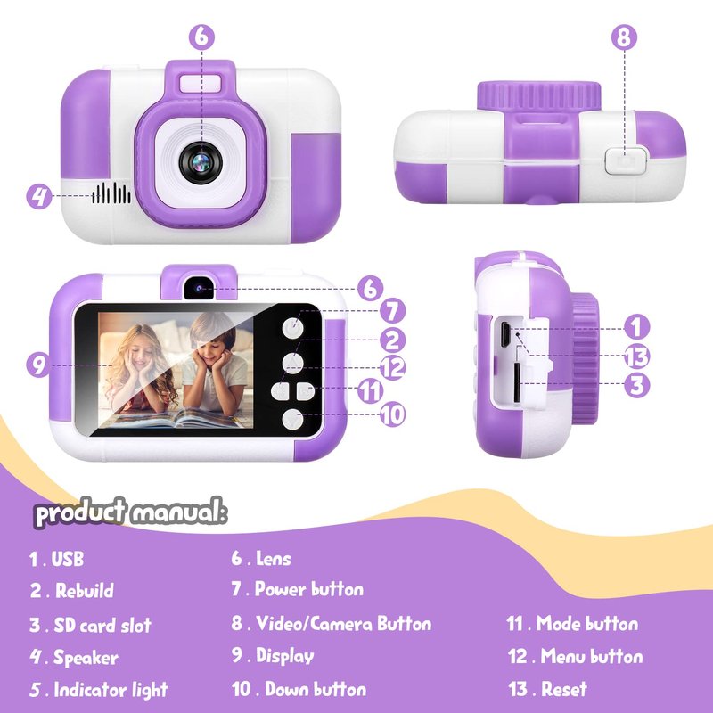 - 【High Solution】The Kids Camera with 2.4 inch HD screen & 24 million pixels HD Dual lens both front and rear & 1920x1080P video - its the best kids vedio camera and toy camera for children's happiness.