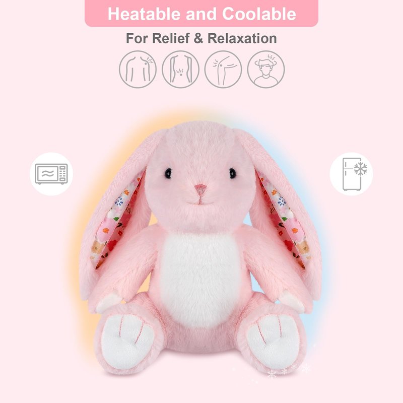 - Stuffed With Love & Relief: Kids will love the pink bunny stuffed animal that with long pink ears and bright eyes! Our cute stuffed animals can not only be a friend of life, but also a coolable & heating pad stuffed animals that support cold & heat therapy to get down stress and chronic pain. Children or adults will always feel secured and loved by snuggling with this bunny plushie
