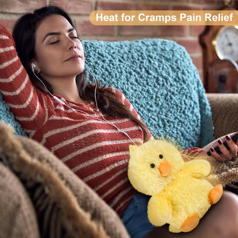 - Health Companion: Simply heat this chicken plush animals toy, the cute plushie chick can turn into a heating pad stuffed animal to delivers 20 mins soothing heat therapy, alleviate neck, shoulder, knee, back pain, stiffness, sore muscles. Or freeze it with a sealed freezer bag for 4 hours, ideal for 10 min cold therapy, cool down at hot night, easing fever, sprains, bruises & swelling. More than that, you can use it as a heat pad or warmer when feeling cold