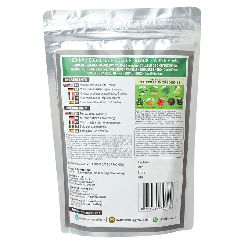 • BLACK HAIR :: SVATV Black henna nourishes the hair by supplying vitamins and antioxidants to the hair. thinning of hair as well as dryness. The 9 herbs also restores the natural colour of hair. it reduce premature graying of hair, because it’s loaded with tannins, a plant compound found in teas that contributes to their rich coloring.