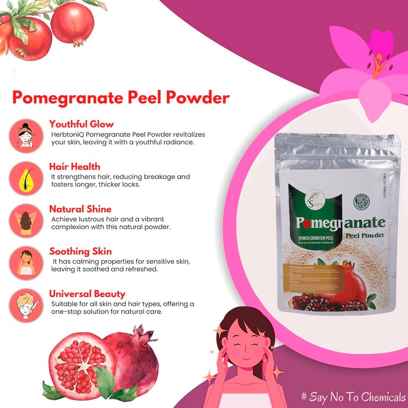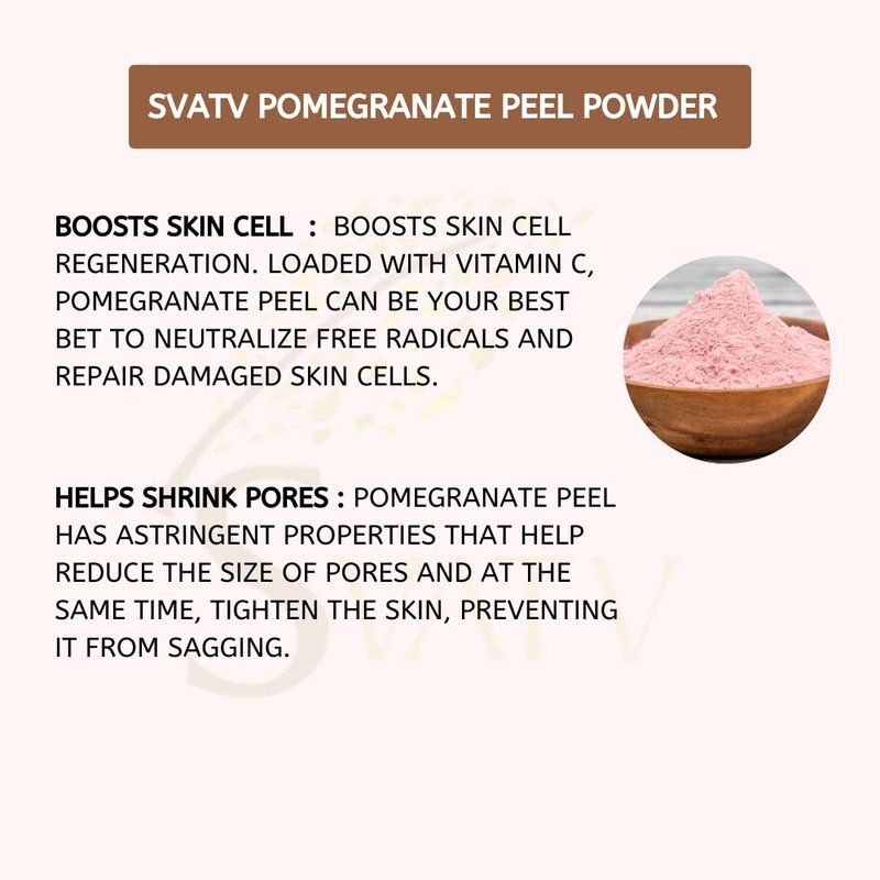 - How to use :: Take Svatv pomegranate peels in a mixer and empty the powder into a clean bowl. Make sufficient powder to last you for a week and store it in an airtight container. Take two spoonfuls of the powder and mix well with some yoghurt to make a paste out of it. Apply this paste on your face and neck and leave for 10 minutes. Next, wash it off with cold water.