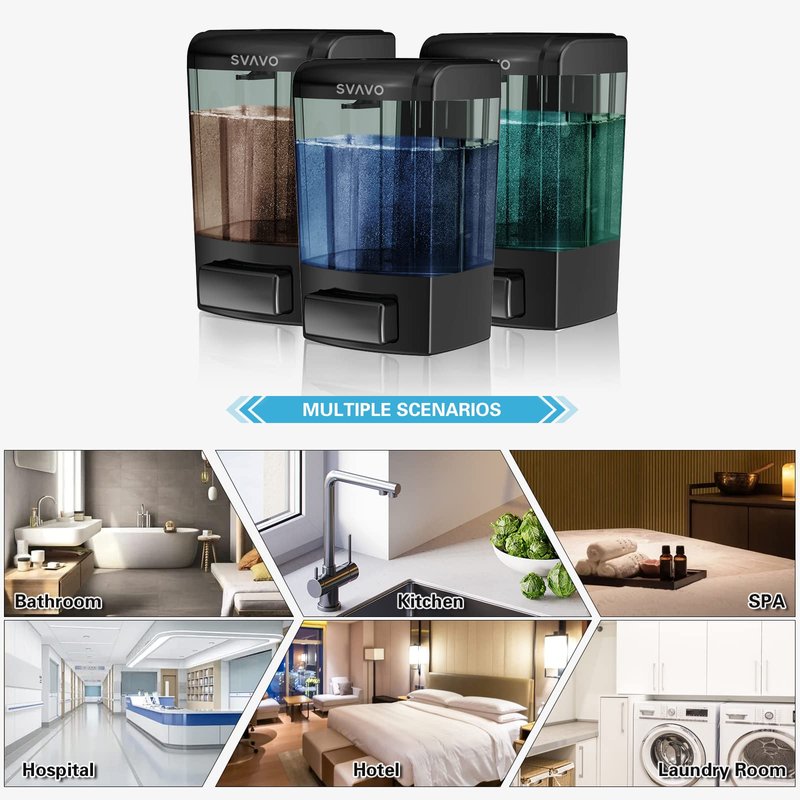 SVAVO wall mounted soap dispenser is designed with modern minimalist style to help you save your countertop and corner space. With the ABS durable material, this product can provide long-lasting strength and use. And it is versatile use for household and commercial (with the lockable design) place, applicable to household near kitchen sink, bathroom sink, shower or wash basin and suitable for holding up to 700ml of liquid detergent, shower gel, shampoo, lotion, etc.