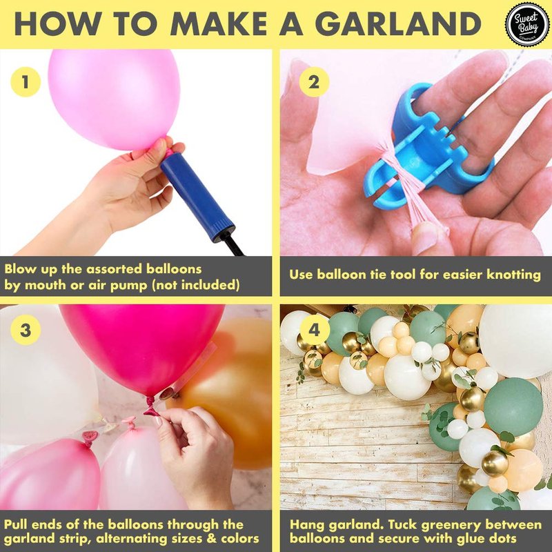 - NO HELIUM NECESSARY: No trip to the store needed! Our bundle includes directions and the supplies you will need to create a beautiful celebration table, for boy or girl, right at home! We include plenty of garland tape (16 feet!) and glue dots for the balloon arch, and enough floral greenery leaves for both garland AND table decor
