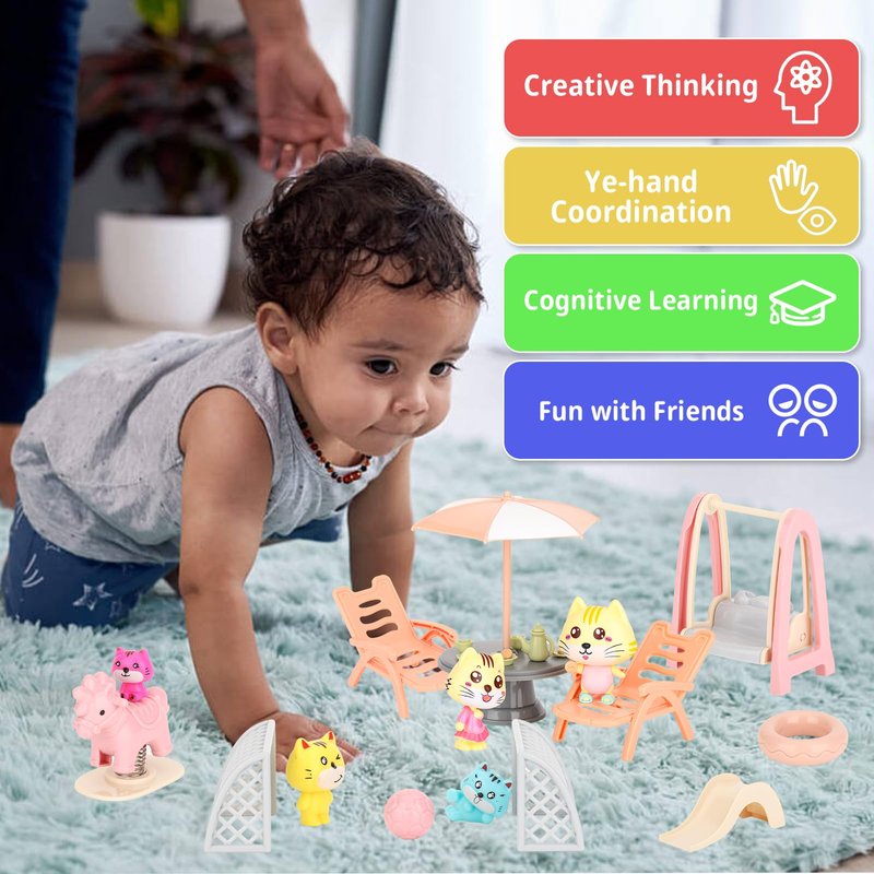 - Healthy Imagination Play: Encourage creative thinking and storytelling as your child engages in pretend play with this cat toy figure playset. Children DIY a cat activity scene with this kitty cat toys and other tiny toy accessories.You little one could develop important social and cognitive skills through imaginative role-playing with these toy figures. They could learn to love life and the people around them through the cute figures.