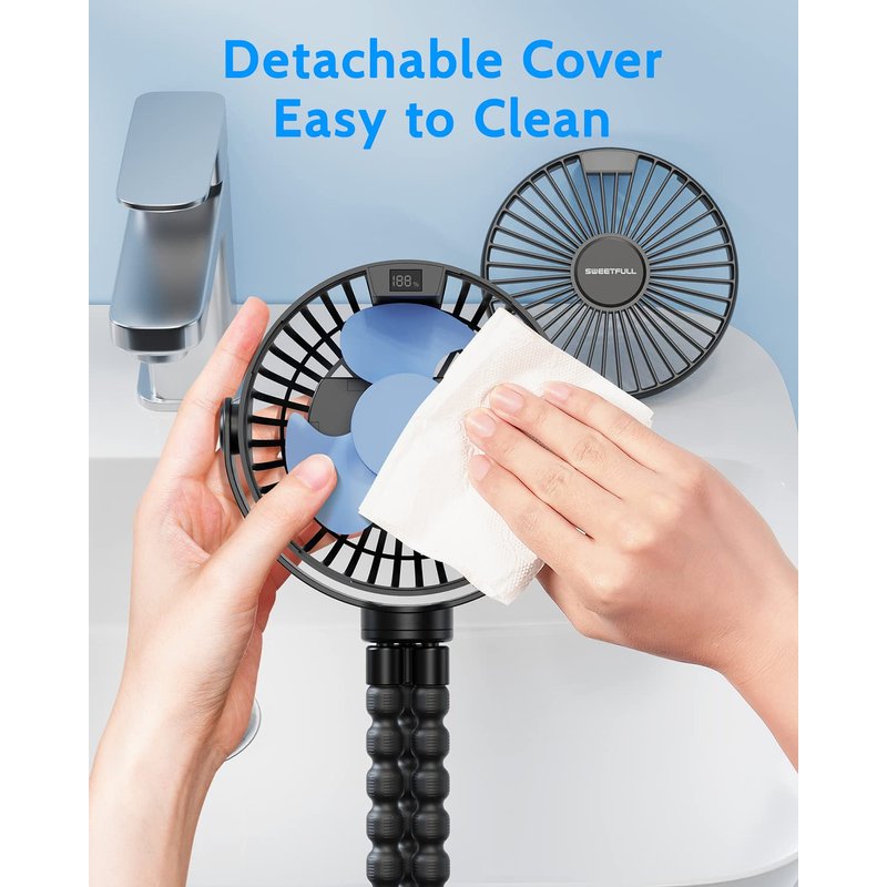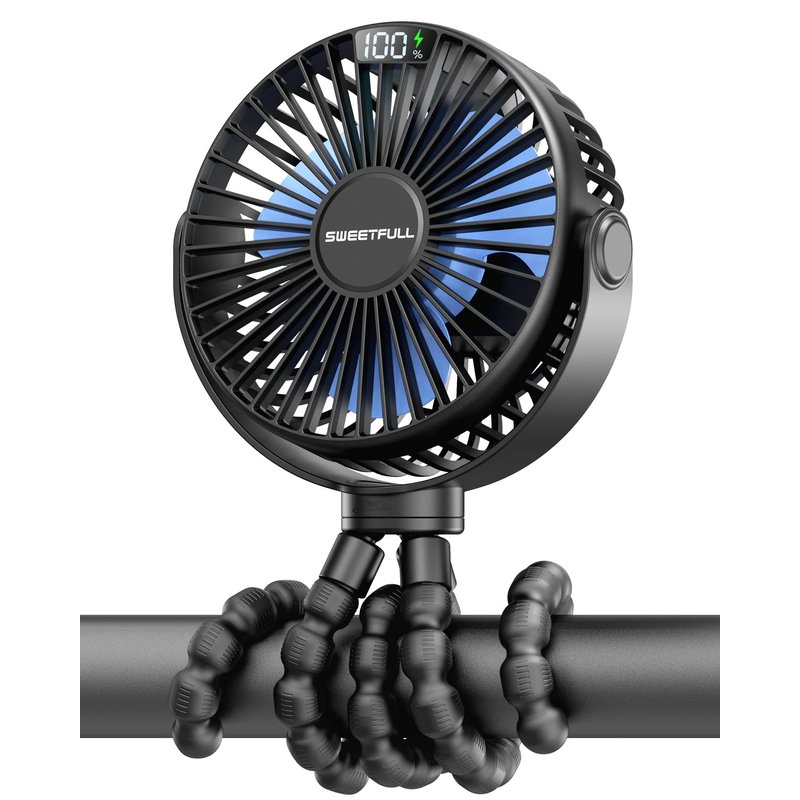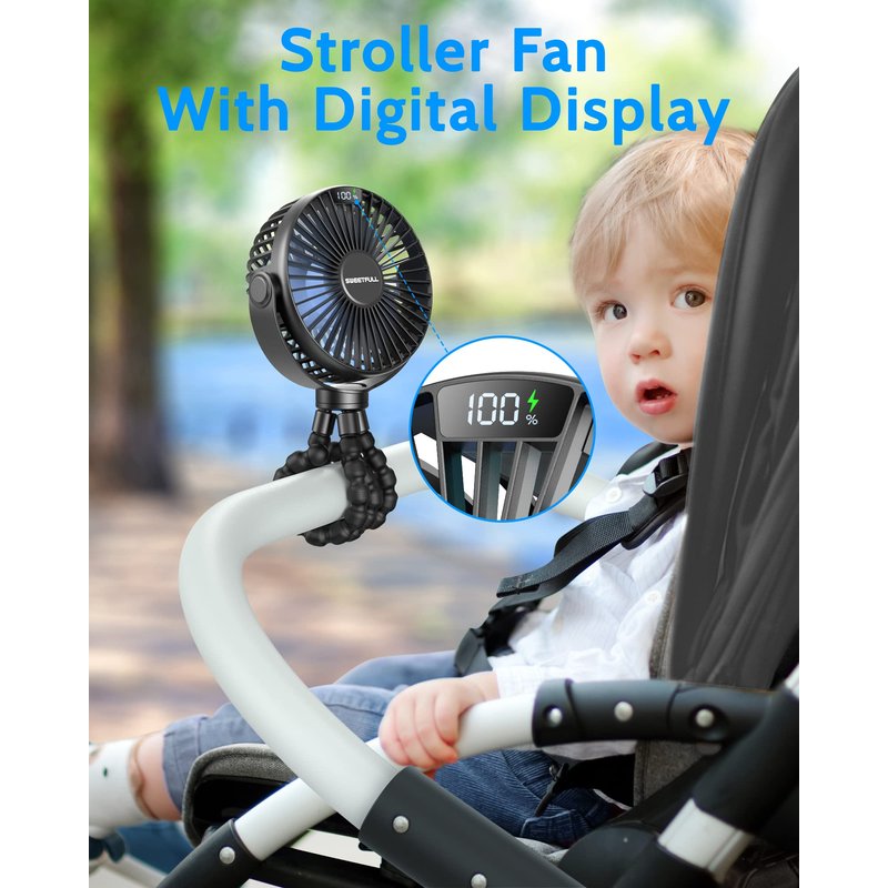 SWEETFULL Portable Stroller Fan, LED Display 6000mAh Battery Operated Mini Clip Fan, 4 Speed Rechargeable Small Personal Fan Handheld Desk Cooling Fan for Car Seat Crib Treadmill Travel(Black)