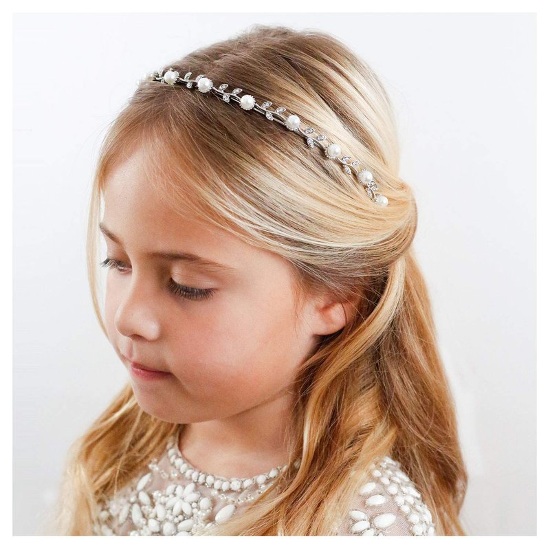 - ❀This flower girl headpiece is created using a mixture of ivory pearls and glittering rhinestones, accenting the piece for a textured lovely feel.