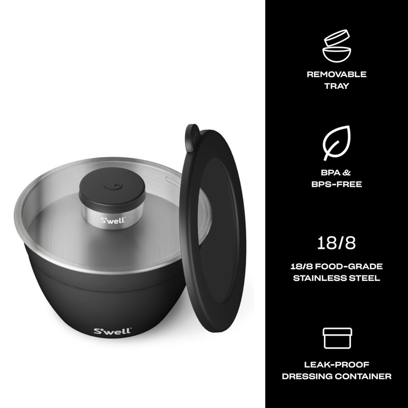 - SALAD BOWL KIT: Upgrade your salad in organized style with the S’well 64oz stainless steel Salad Bowl and 2oz Mini Canister. Features a leakproof lid, removable tray and closable canister for dressing or toppings. Sleek and beautifully crafted. Top-rack, dishwasher safe.