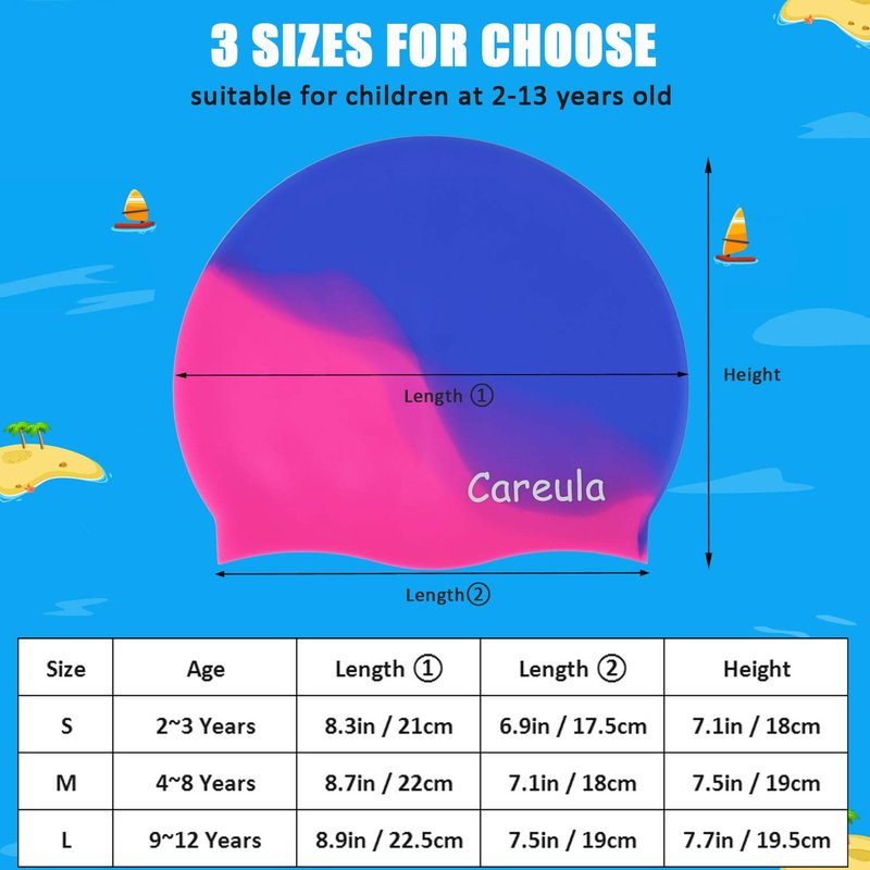 Safety & High Quality Material: Careula Kids Swimming Caps are made of 100% premium quality elastomeric silicone which is soft and durable, tear-resistant, non-toxic, latex-free. Silicone caps can stay in good condition where other caps need to dry in a good position or need powder to keep it in good condition.