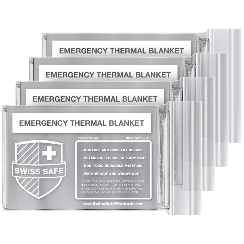 WHY SWISS SAFE BLANKETS Swiss Safe Products has designed the most advanced emergency blanket on the market - meticulously designed for outdoor survival, emergency preparedness or emergency first response. PREMIUM MYLAR: It all starts with the material, metalized polyethylene, that reflects 90% of your body heat while offering resistance from rain, snow, moisture, cold, and heat. ULTIMATE VERSATILITY: Waterproof, windproof, and snowproof blankets are great for emergency first aid while hiking, backpacking, climbing, camping, mountain biking, or just lost in the wilderness. CONVENIENT 4-PACK: Includes four individually wrapped blankets so you can easily throw them in your backpack, car, go-bag, or camping bag. Small enough to keep anywhere for when emergency strikes. EXCLUSIVE COLORS: The only thermal blanket to offer a unique variety colors while also providing a superior product design with emergency survival in mind. All colors offer the same thermal efficiency performance. Perfect for keeping dry in damp, wet, cold, rainy environments. UNLIMITED USES: Use as tent footprint, backpack cover, rain poncho, emergency signal, solar oven, shade cover, fishing lure, bird repellent, emergency shelter, sleeping bag liner, ground cover, bivouac sack, wind blocker, arm sling, tourniquet, bivvy, trail marker, water collector, or even snow melt container. Even more creative uses: Some customers even report using these for halloween costumes, christmas gift wrapping paper, or other holiday decorations. We always love to hear what creative uses our customers come up with! TRUSTED QUALITY: Customers from the around the world trust Swiss Safe to supply their emergency preparedness needs. If you are not completely satisfied with the quality of your item, we will happily replace and/or give you your money back - no questions asked!