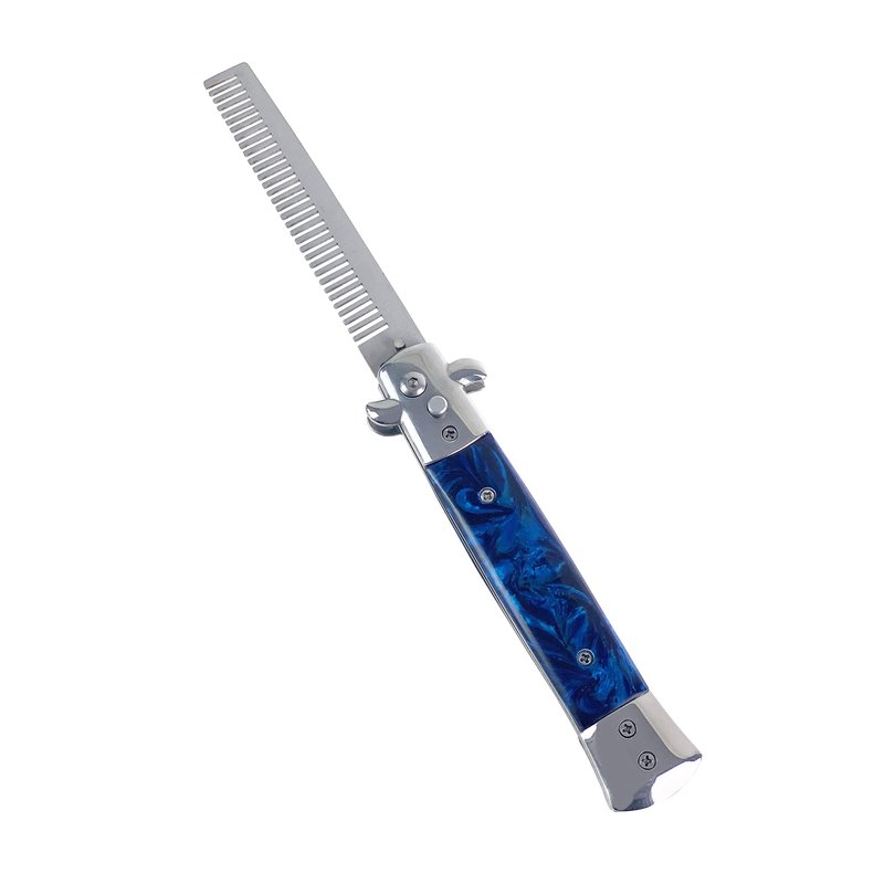Switchblade Comb Pocket Knife Hair Brush Automatic Push Button Folding Barber (Blue Marble)