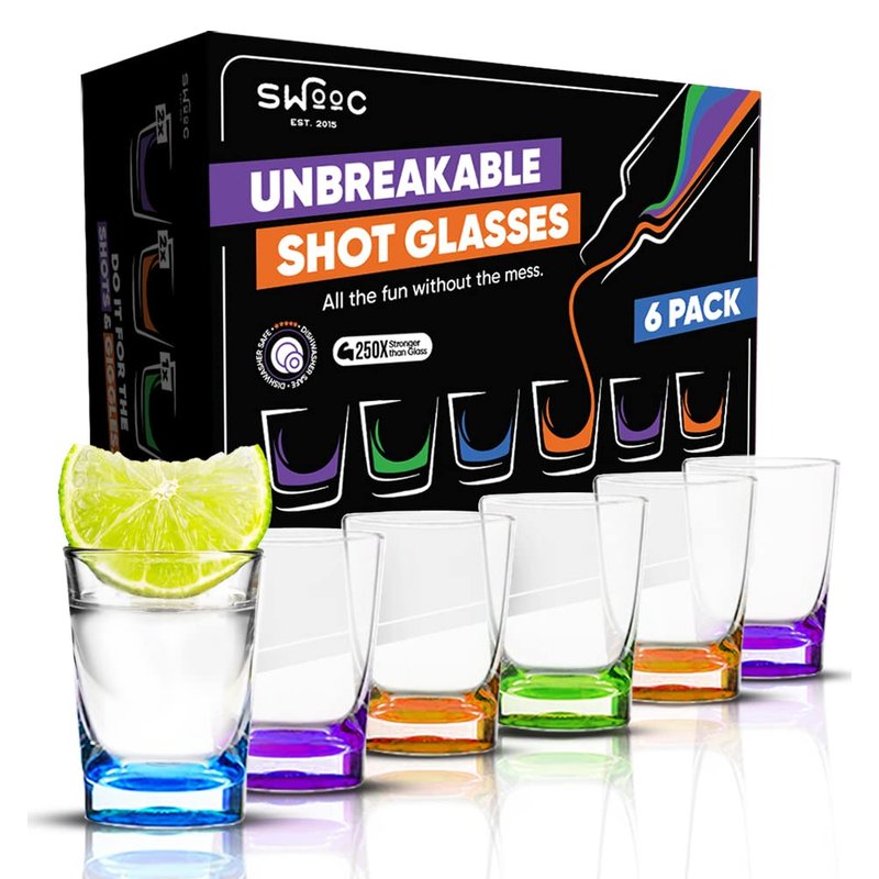 SWOOC - Unbreakable Shot Glasses Set (6 Pack) - 250x Stronger Than Glass, 25x Stronger Than Acrylic - Colorful & Dishwasher-Safe - 1.5oz Reusable Drinkware for Indoor/Outdoor Fun - DUNZO Compatible