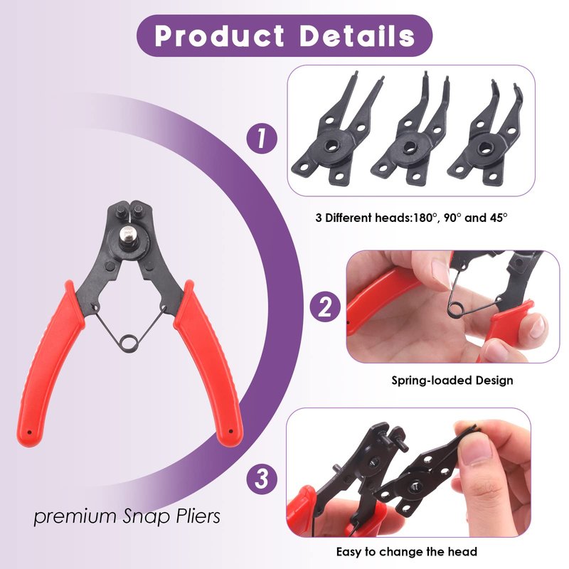 - π₯ 4 in 1 Snap Ring Pliers ------ 1Pcs 5-inch/12.7 cm snap pliers handle, 2Pcs 180 degree Straight Ends jaws, 1Pcs 45 degree Bend jaws, 1Pcs 90 degree Bend jaws. This 4 piece specialty pliers set is primarily used in the removal of a variety of special connection clips such as retaining rings, snap rings and circlip removal. The holes in different nozzles can be adjusted to operate inward or outward as required. According to the replacement of different holes and beak can meet your different needs.