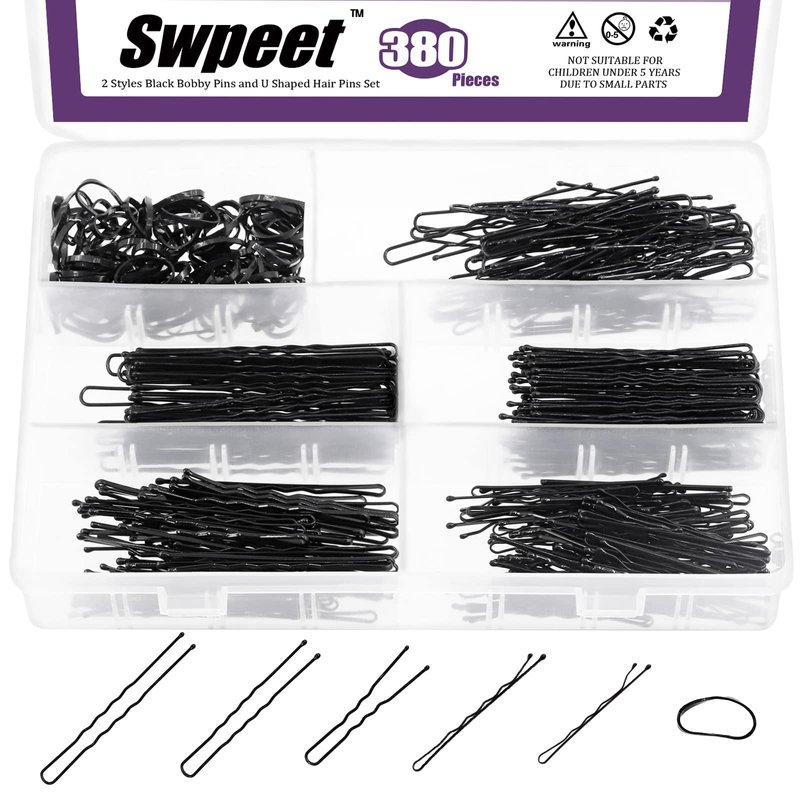 Swpeet 380Pcs 2 Styles 1.9Inch 2.4Inch 2.7Inch Black Hair Pins Bobby Pins with Rubber Bands Kit, Including 120Pcs Bobby Pins and 160Pcs U Hair Pins Hair Clips with Soft Elastic Bands for Girls and Women