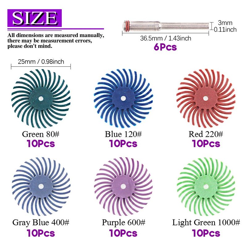 - ♥ ♥ WHAT YOU GET ------ In this kit, You will get 60Pcs 6 Mixed Grit Radial Bristle Disc kit, These polishing brushes have 6 different grit with 6 various colour and every grit has 10 pieces for different needs. Including Green: 80 Grit; 120 Grit; 220 Grit; 400 Grit; 600 Grit; 1000 Grit; Meanwhile you will get 6Pcs 1/8"" Shank perfect for Rotary Tools.