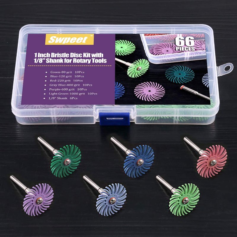 Swpeet 66Pcs 1 Inch 6 Mixed Grit 80/120/220/400/600/1000 Radial Bristle Disc Abrasive Brush Gap Polishing Pad Buffing Wheel Assortment Kit with 1/8" Shank for Rotary Tools Cleaning Finishing Deburring