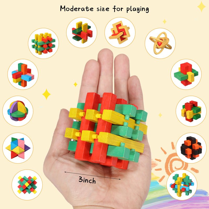 Features: These 3D brain teasers are designed to stimulate brain activity significantly, thereby fostering quick thinking and improved cognitive functions. Whether you're young or old, these brain puzzles promise a fun and refreshing workout for your mind. These puzzle brain games are highly portable. They are easy to carry around, so you can enjoy brain stimulating fun on a trip, flight, at a picnic, or during office breaks. You can also easily store them, saving your space. Specifications: Material: wooden Color: colorful Size: as shown in the picture Package includes: 12 x Colorful wooden brain teaser puzzles Notes: Manual measurement, please allow slight errors on size. The color may exist a slight difference due to different screen displays. Our products are suitable for people over 6 years old. Small items are included, please keep them away from little ones in case of choking risk. Little ones should use our product under the supervision of adults.