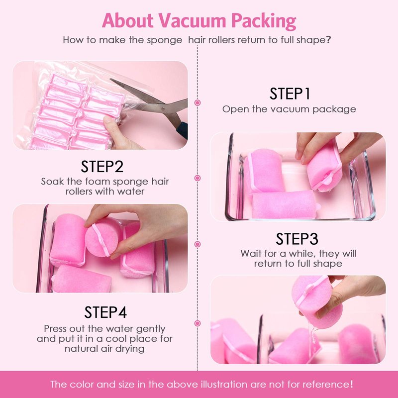 - Vacuum packing: the sponge hair curlers are packed in vacuum, we suggest that after receiving the product, soak the foam sponge hair rollers with water to make them return to full shape first, then press out the water gently and put it in a cool place for natural air drying