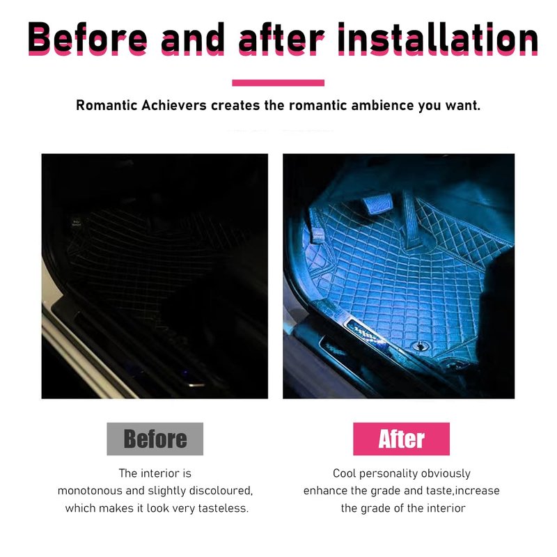 - 【Decorative Effect】: This car ambient light is rich in color, which will create a romantic and fun atmosphere for your car at night. It can also help you find things easier in the dark. It has soft lights that will decorate your car's interior well. The excellent decorative effect can greatly improve your driving pleasure.